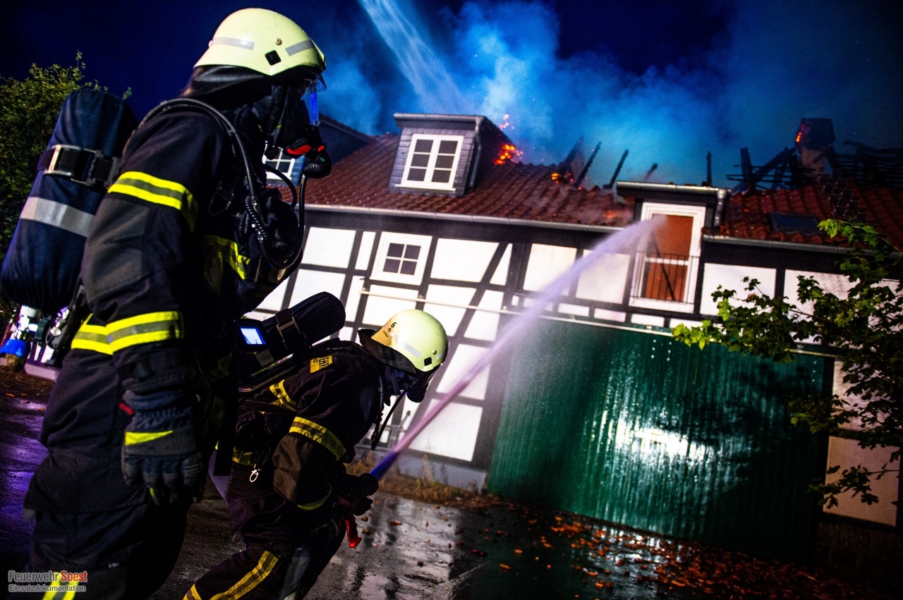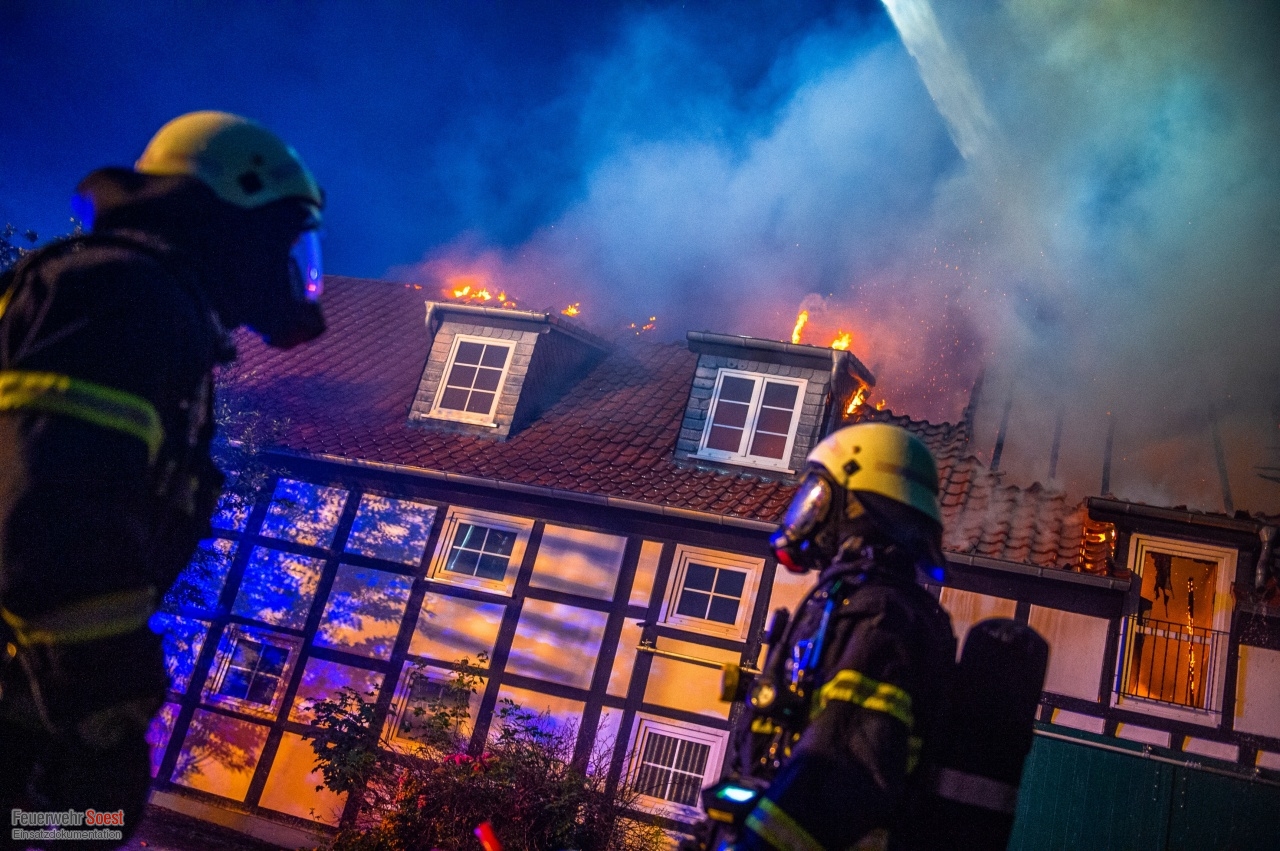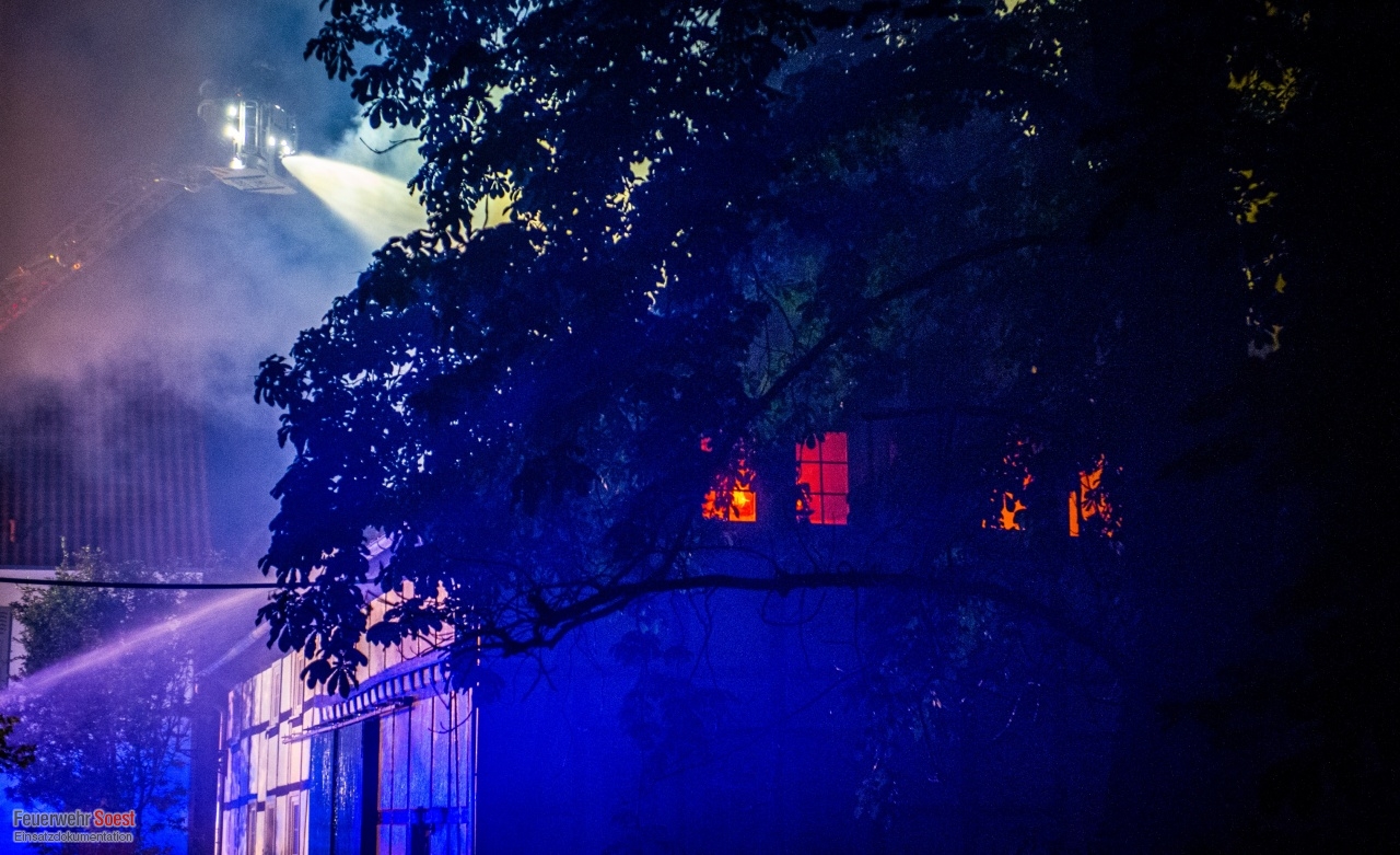 Gemeldet wurde eine Rauchentwicklung aus einem Dach. Dies konnte bereits auf der Anfahrt bestätigt werden. Nachdem die ersten Kräfte eingetroffen waren, schlugen die Flammen bereits aus dem Dachstuhl.Einen ausführlichen Beitrag gibt es beim Soester Anzeiger