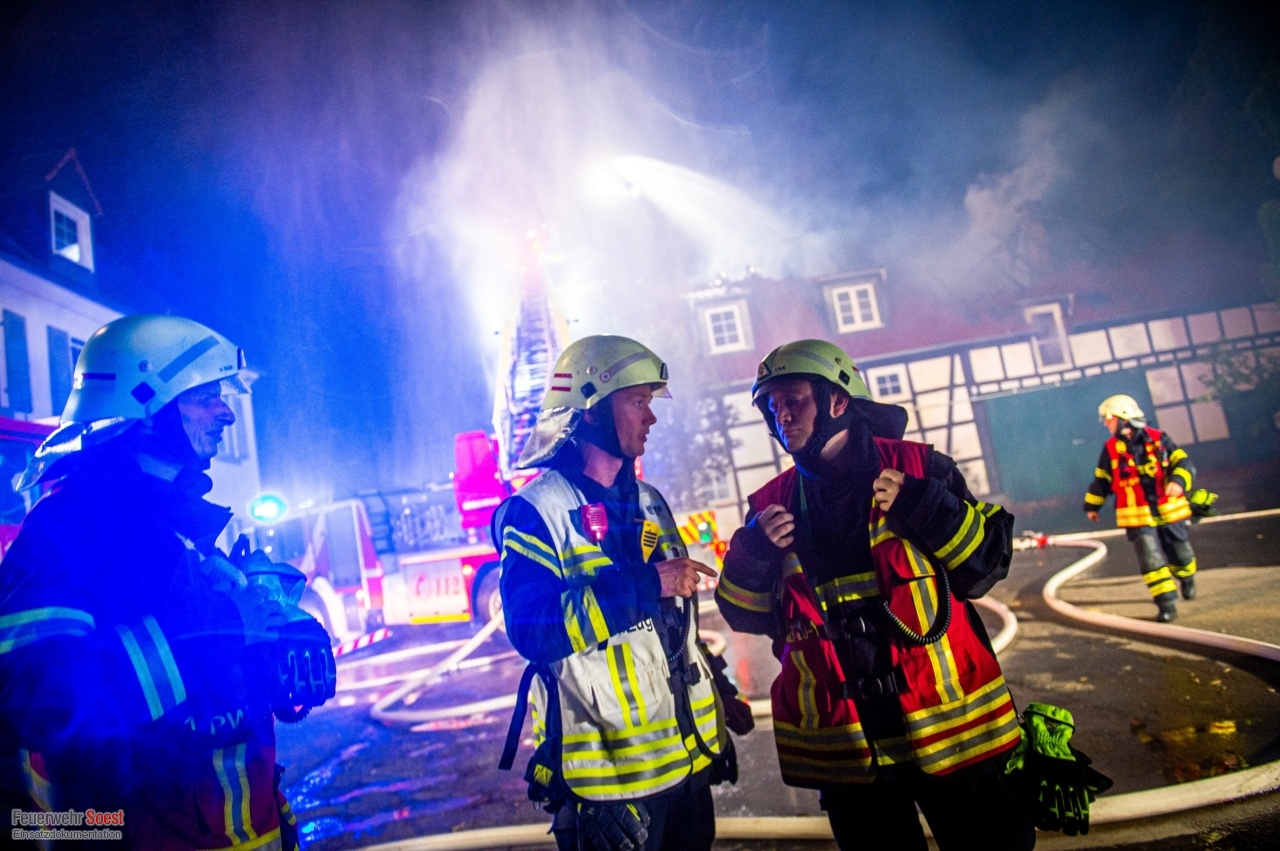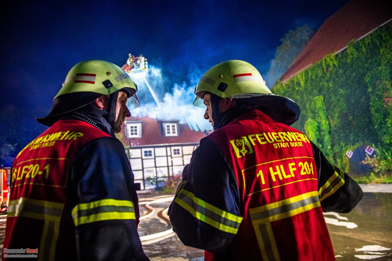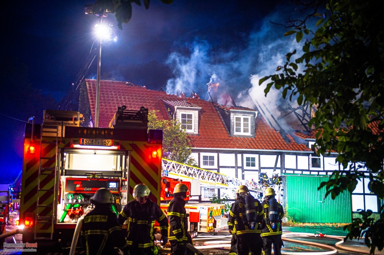 Gemeldet wurde eine Rauchentwicklung aus einem Dach. Dies konnte bereits auf der Anfahrt bestätigt werden. Nachdem die ersten Kräfte eingetroffen waren, schlugen die Flammen bereits aus dem Dachstuhl.Einen ausführlichen Beitrag gibt es beim Soester Anzeiger