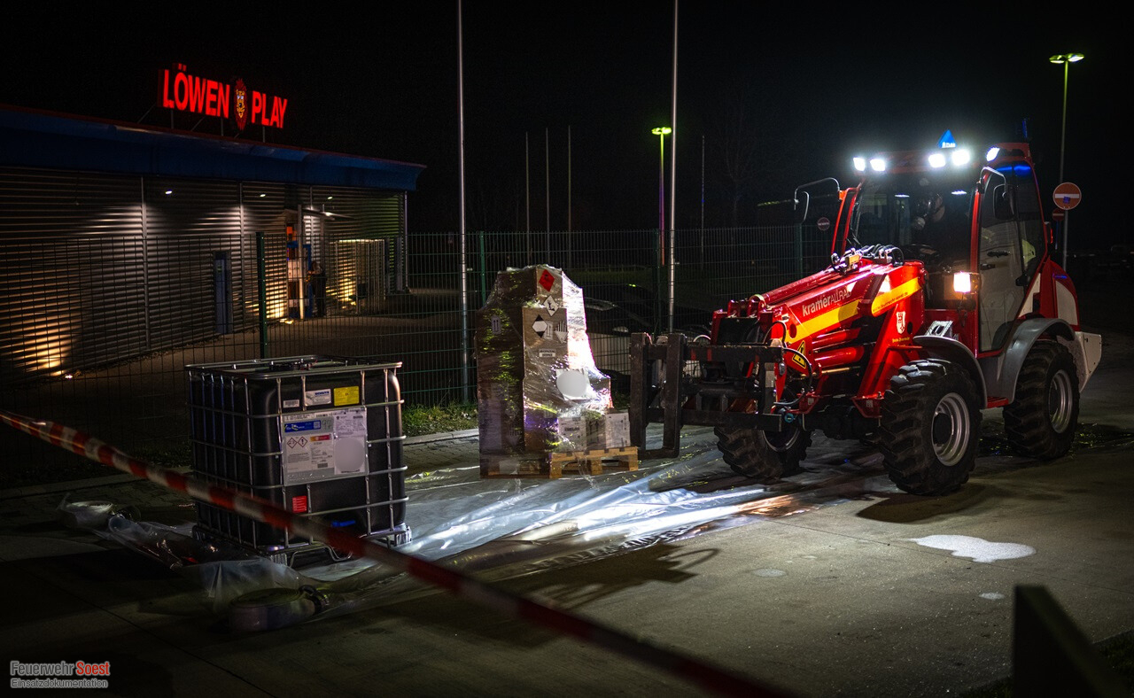 Der LKW wurde durch die Einsatzkräfte gesichert und in den speziell eingerichteten Bereich umgeparkt. Dort erfolgte die Entladung des betroffenen Stückguts mittels Telelader der Feuerwehr.