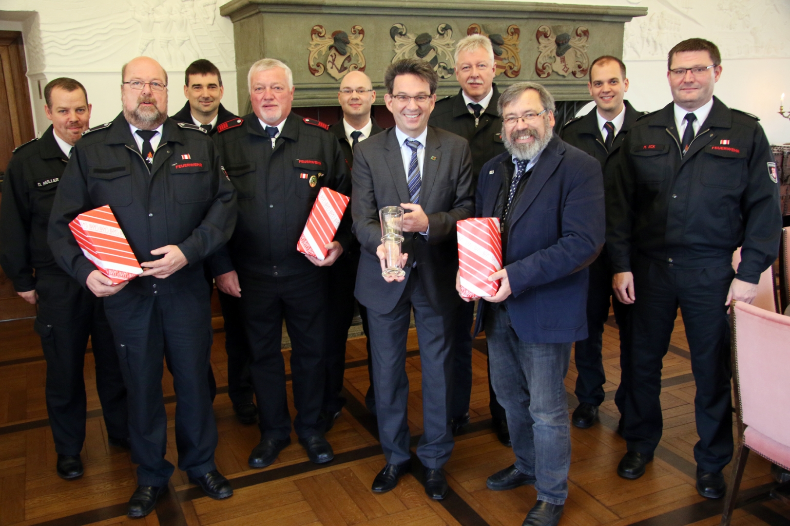 Ein Schmuckglas mit eingraviertem Soester Schlüssel überreichte Ruthemeyer an die drei anwesenden Funktionsträger: Neben Vedder nahmen auch Brandoberinspektor und Zugführer Franz-Josef Langenhorst sowie Unterbrandmeister Karl-Heinrich Topp (beide Ostönnen) an der Abschiedsrunde bei Kaffee und Keksen im schönen Rittersaal teil. „Der Dank ist natürlich noch viel größer für den ehrenamtlichen Einsatz“, unterstrich Ruthemeyer: „Die Stadt weiß, was sie an ihrer Freiwilligen Feuerwehr hat.“ Folgende Wehrleute standen mit auf der Abschiedsliste, fehlten aber an dem Nachmittag: Hauptfeuerwehrmann Wolf-Dieter Sander (Hattropholsen), Dirk Jasper (Hattrop), Unterbrandmeister Martin Daners (Müllingsen) und Hauptbrandmeister Jörg Dittkowski (Soest).