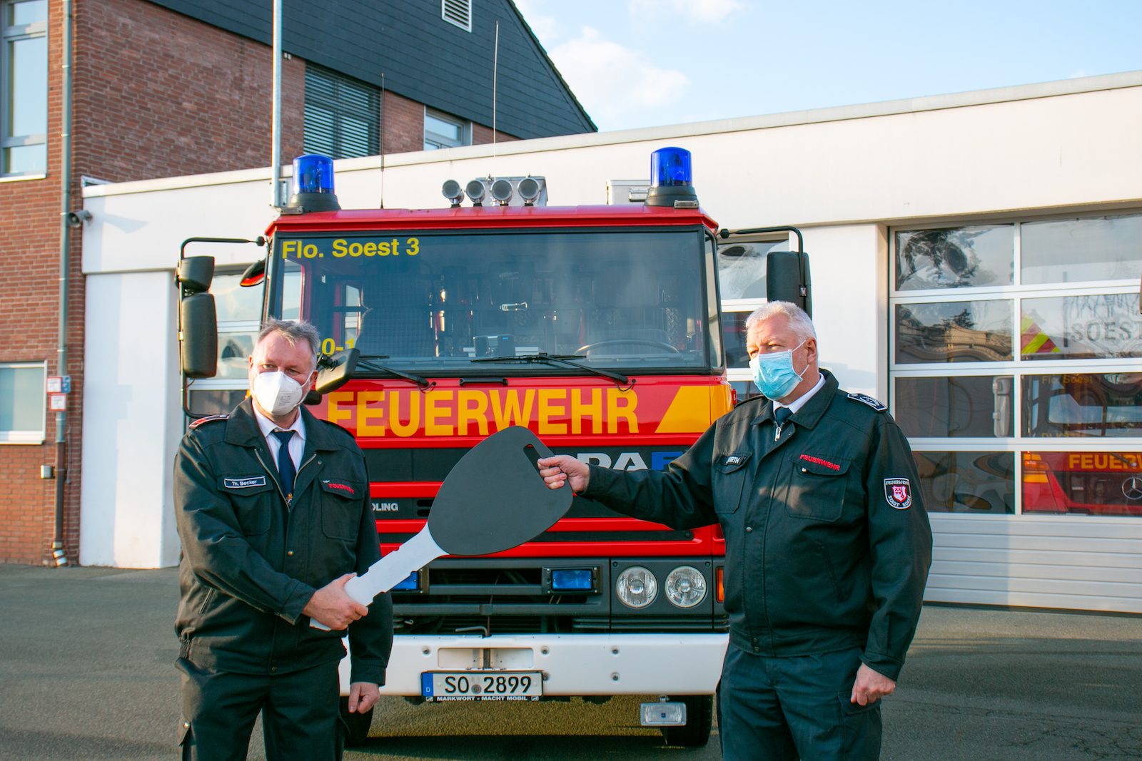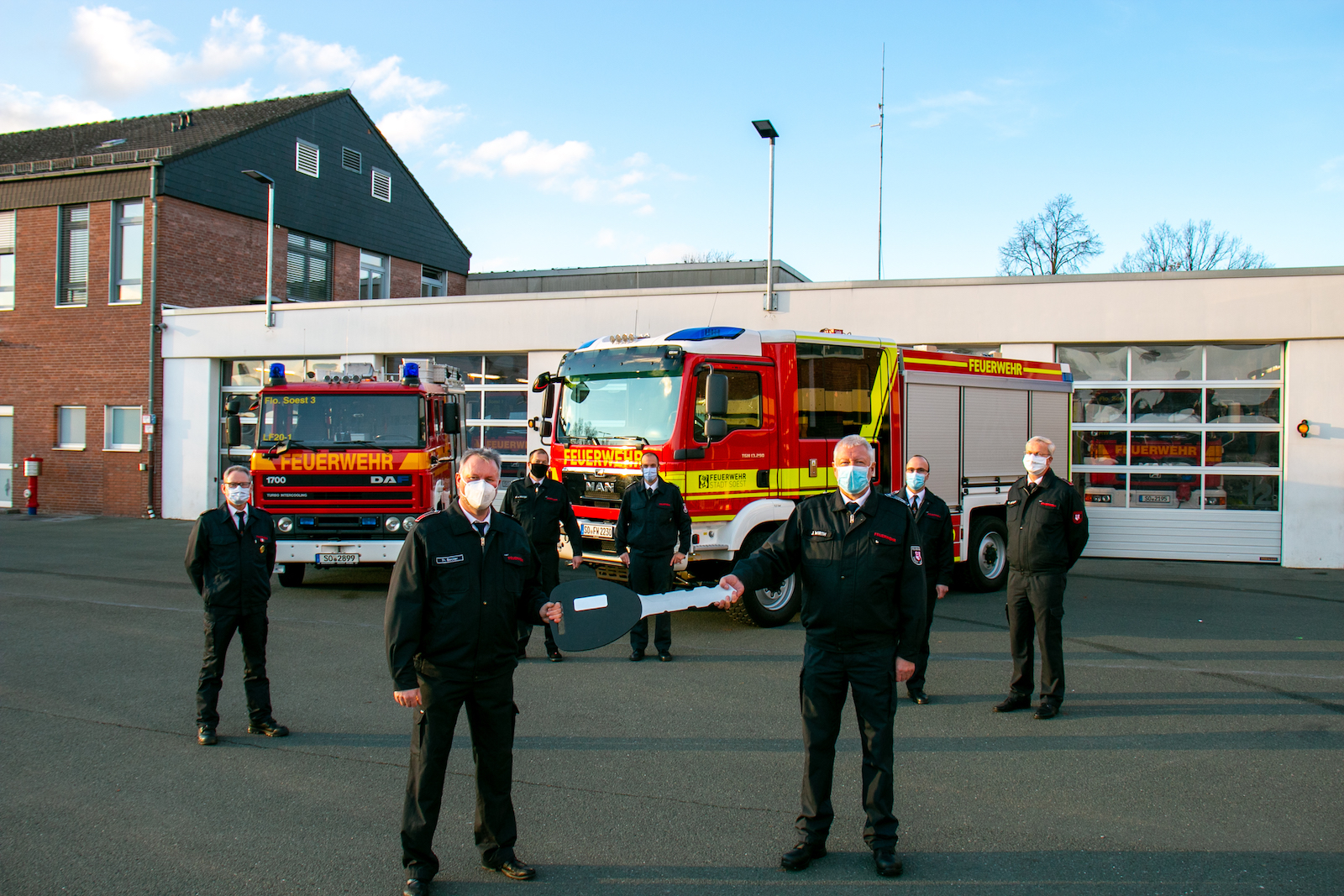 In einem sehr kleinen und Corona-konformen Rahmen wurde gestern das neue Löschfahrzeug mit dem Funkrufnahmen „Florian Soest 3 LF10-1“ an den Löschzug 3 übergeben. Dieses Fahrzeug vom Typ MAN TGM 14.290 mit einem Aufbau von der Fa. Magirus ersetzt nun einen ca. 28 Jahre alten DAF.