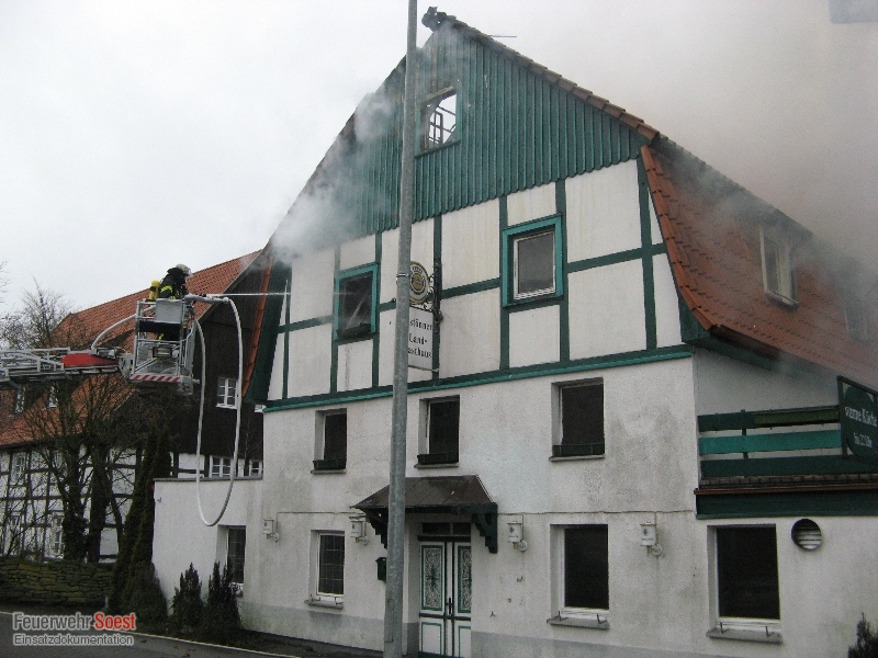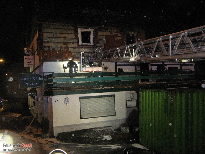 In einer ehemaligen leerstehenden Gaststätte brannte der Dachstuhl in voller Ausdehnung. Eine Riegelstellung sowie ein Löschangriff über zwei Drehleitern wurde eingeleitet.