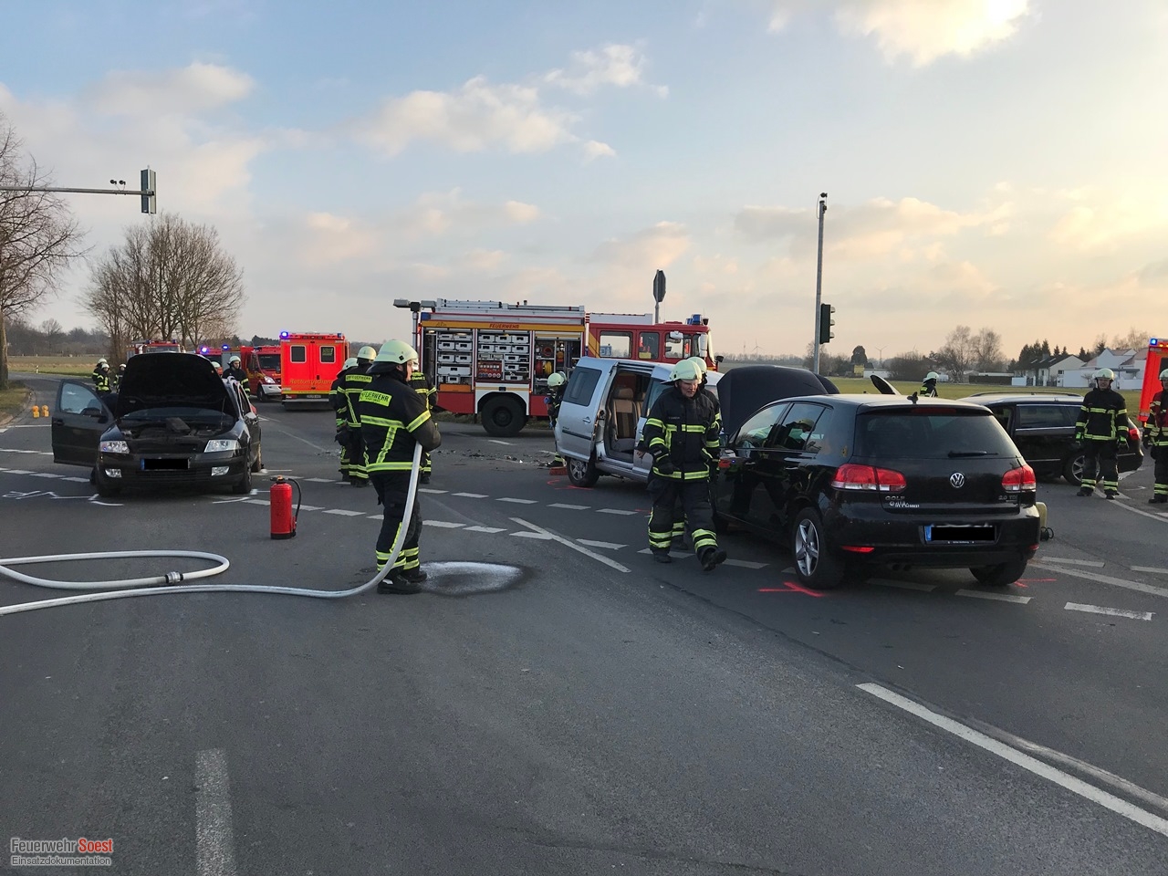 Im Kreuzungsbereich waren 2 Fahrzeuge zusammengestoßen, drei weitere Fahrzeuge waren ebenfalls beteiligt. Die Leitstelle alarmierte daraufhin Rettungsmittel nach Stichwort MANV1 (Massenanfall von Verletzten) sowie die Feuerwehr. In beiden Fahrzeugen waren die Fahrer eingeschlossen und mussten durch die Feuerwehr mit hydraulischem Rettungsgerät befreit werden.