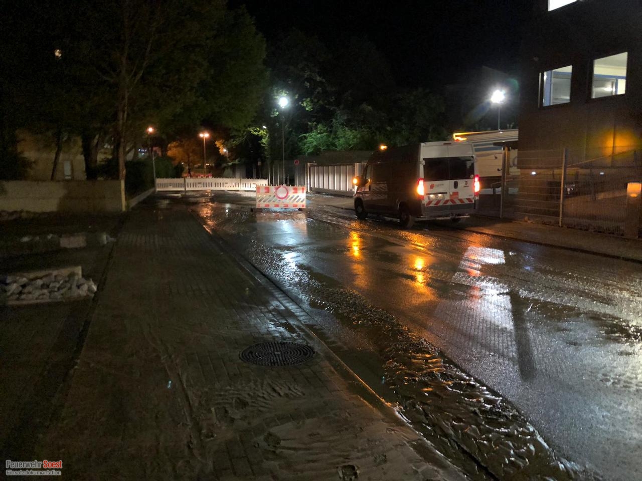 Am Oelmüllerweg kam es zu einem Wasserrohrbruch, wodurch die Straße unterspült wurde. Das Wasser drang auch in eine nahe liegende Tiefgarage ein.