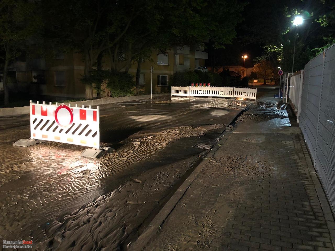 Durch den Wasserrohrbruch war die Ausfahrt des Firmengeländes einer Großwäscherei nicht mehr möglich. Damit die LKW dennoch das Firmengelände verlassen können, wurde der Zaun teilweise geöffnet.