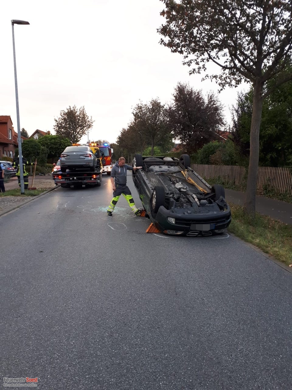 Nach einem Verkehrsunfall ist ein Pkw auf dem Dach liegen geblieben. Ersten Informationen zu Folge sollte der Pkw auch brennen, dies bestätigte sich glücklicherweise nicht. Die Person hatte bei unserem Eintreffen den Pkw bereits verlassen und konnte an den Rettungsdienst übergeben werden.