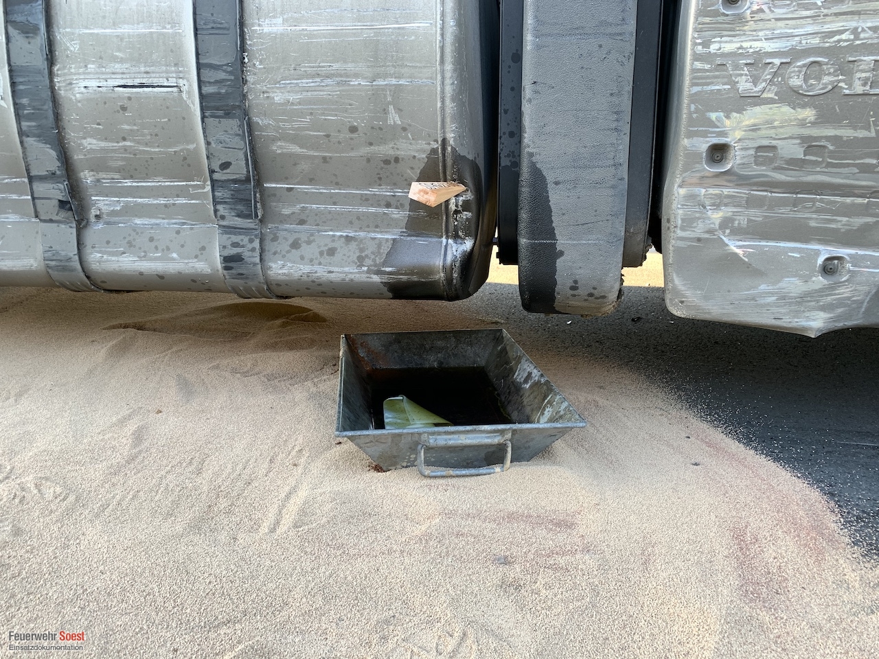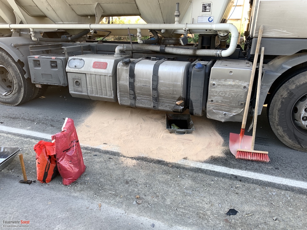 Nach einem Verkehrsunfall wurde der Kraftstofftank eines LKW beschädigt. Das Leck wurde provisorisch verschlossen und anschließend wurde der restliche Kraftstoff abgepumpt.