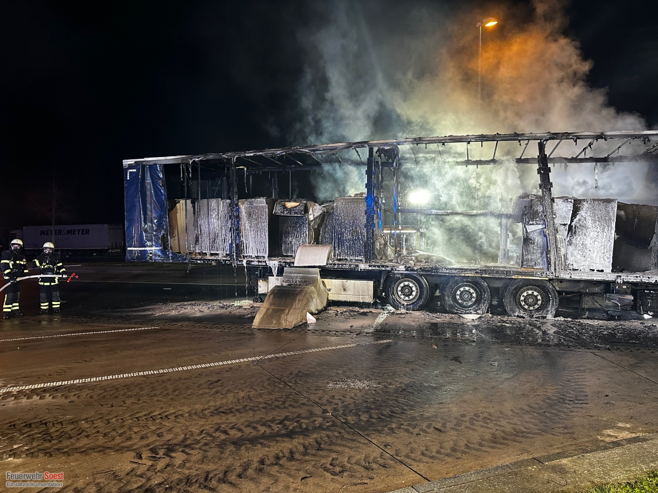 Ein Reifen an einem Lkw-Anhänger hatte sich entzündet. Der Lkw-Fahrer konnte den Auflieger schnell abkoppeln und die Zugmaschine in Sicherheit bringen. Wir führten unverzüglich eine umfangreiche Brandbekämpfung durch. Da auf der Autobahn keine Hydranten vorhanden sind, brauchten wir sehr viel Löschwasser. Dazu erhalten wir Unterstützung durch die Feuerwehr Anröchte und Möhnesee. Mit Hilfe unseres Radladers wurde die Ladung des Lkw, die aus Paletten mit Papier bestand, entladen und abgelöscht. Auch der restliche Lkw-Anhänger konnte so abgelöscht werden. Das entladene Papier wurde anschließend in einen großen Schuttcontainer umgeladen.