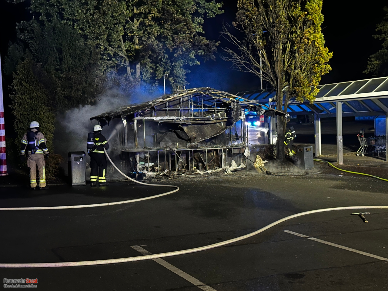 Als unsere ersten Kräfte an der Einsatzstelle eintrafen, stand der Imbissstand bereits in Vollbrand. Wir begannen sofort mit der Brandbekämpfung und setzten dazu zwei Strahlrohre unter schwerem Atemschutz ein. Durch unser schnelles und koordiniertes Vorgehen konnten wir den Brand zügig unter Kontrolle bringen und schließlich vollständig löschen.