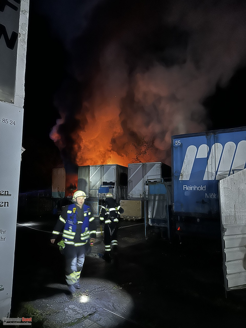 Vor Ort bot sich unseren Einsatzkräften ein deutliches Bild: Eine LKW-Wechselbrücke stand in Vollbrand. Drei weitere angrenzende Wechselbrücken waren durch die enorme Hitzeentwicklung unmittelbar bedroht. Durch das schnelle und koordinierte Eingreifen unserer Kräfte konnte ein Übergreifen der Flammen auf diese drei zusätzlichen Wechselbrücken glücklicherweise verhindert werden.